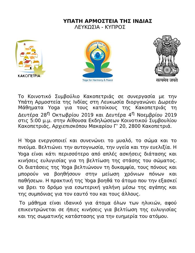 Δωρεάν Μαθήματα Yoga για τους κατοίκους Κακοπετριάς (28/10 & 4/11/2019)